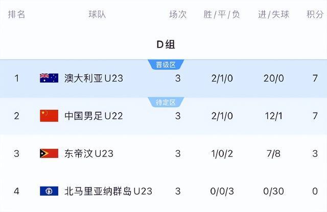 最终全场比赛结束,中国队0比0战平澳大利亚队,澳大利亚积7分20个净胜球排名小组第一晋级2025年U23亚洲杯正赛,中国队则以2胜1平积7分11个净胜球的成绩排名D组第二,提前锁定成绩最好的四个小组第二的身份晋级。