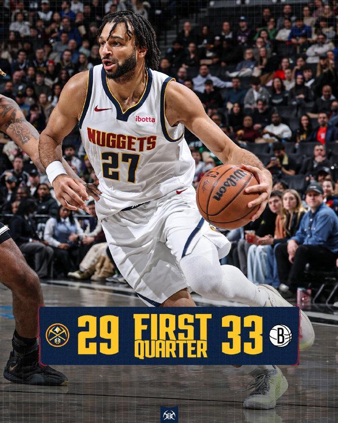 掘金上一场客场108-113惜败骑士,篮网过去3场连输勇士、火箭与奇才遭遇3连败。本场掘金缺少约基奇、卡约、瓦兰丘纳斯,篮网缺少克拉克斯顿、海史密斯。掘金迎来戈登与布劳恩复出,波特也复出对阵旧主,首节前半节双方缠斗至14-14,篮网一波9-2攻势取得领先优势,戈登替补复出帮助掘金缩小差距,首节比赛结束掘金追到29-33落后篮网4分。