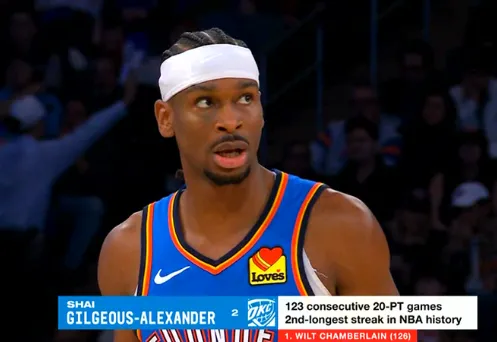 雷霆球员亚历山大得到26分3篮板8助攻,个人已连续连续124场比赛砍下20+得分,距离超越威尔特-张伯伦仅差3场。